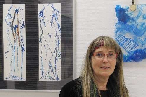 Bärbel Kock vor ihren Werken im KUNSTSCHAUfenster